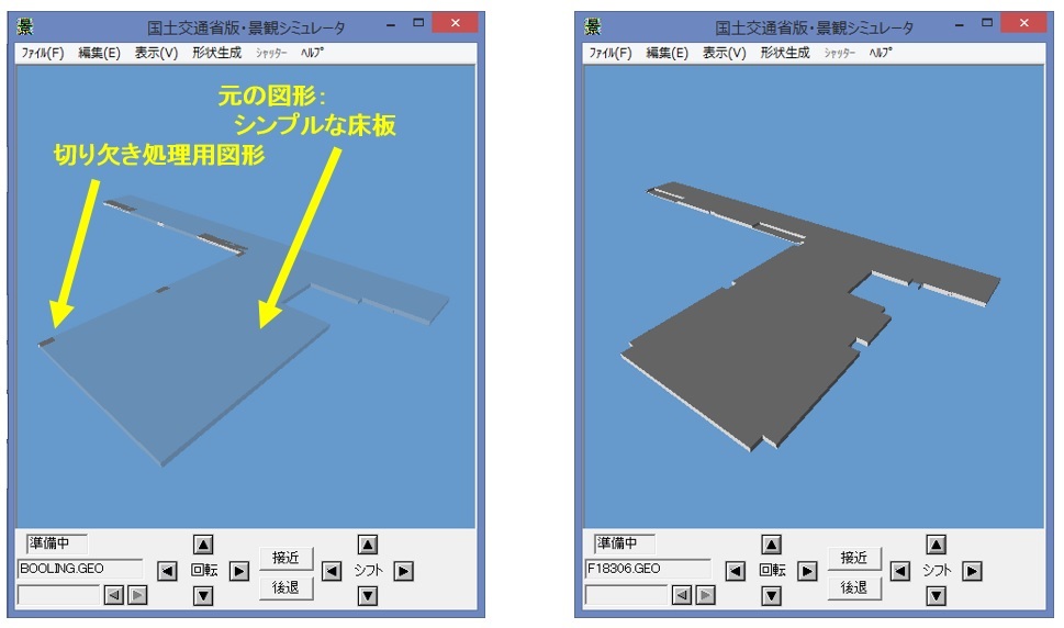 ・生成したgeoファイルを景観シミュレータにロードする時点でBOOL演算を実施
